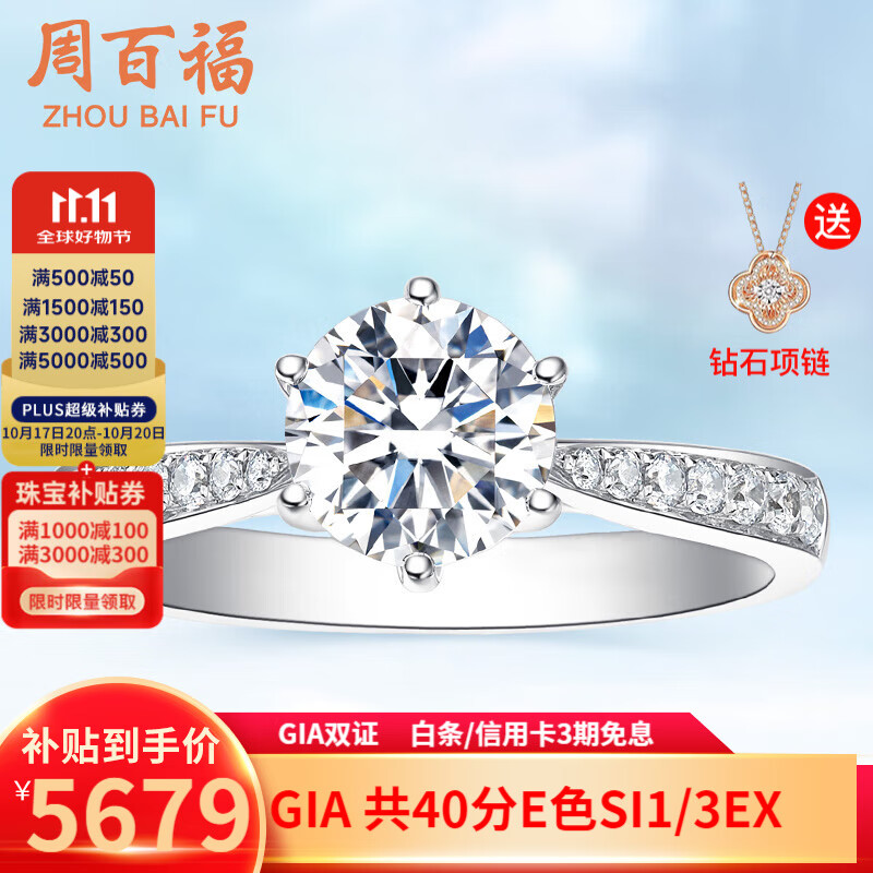 百亿补贴:周百福白18K金钻戒 结婚求婚钻石戒指女gia裸钻定制六爪真钻情人节礼物 【GIA双证】主石40分E色VS2/3EX