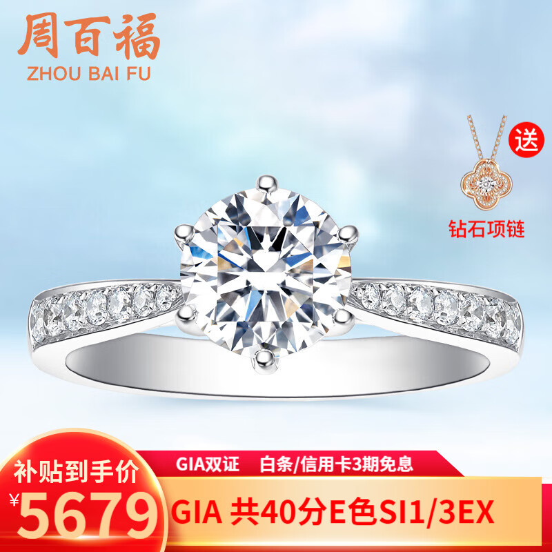 百亿补贴:周百福白18K金钻戒 结婚求婚钻石戒指女gia裸钻定制六爪真钻情人节礼物 [GIA双证]主石50分D色SI1/3EX