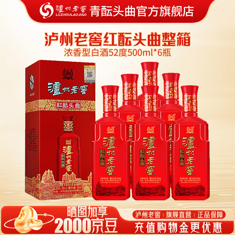 泸州老窖 青酝头曲 红酝头曲 浓香型 高度白酒纯粮食酒口粮酒婚宴酒 52度 500mL 6瓶 整箱配3个礼袋