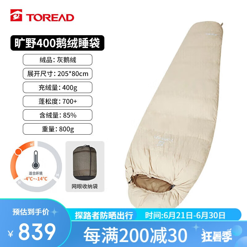 探路者(TOREAD)鹅绒睡袋 23秋冬轻盈保暖防水防潮羽绒睡袋透气易收纳TECCBL80869