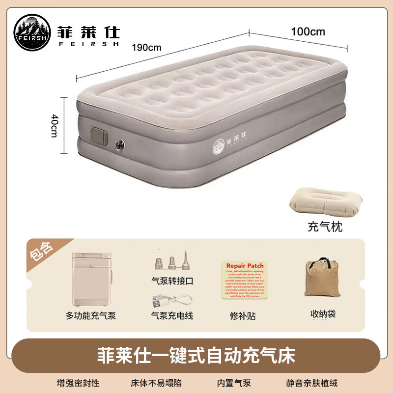 菲莱仕(FEIRSH)充气床垫打地铺家用双人便携户外露营野营加厚自动气垫带气泵 单人【40CM加高】充气床+桃绒枕