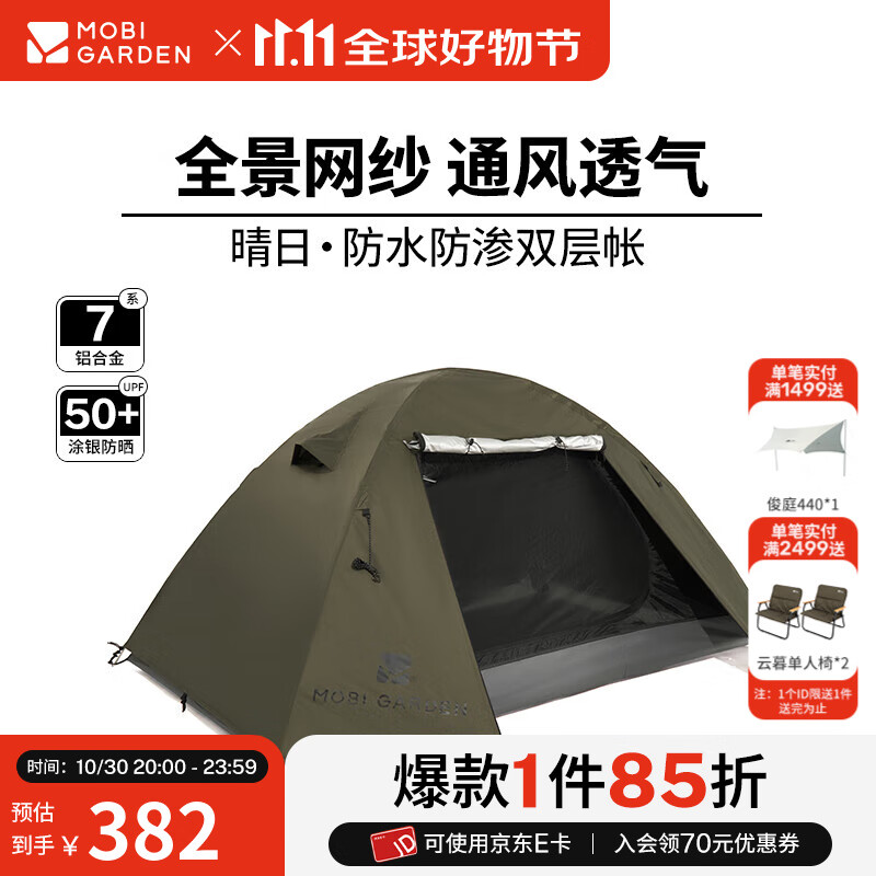牧高笛(MOBIGARDEN)晴日 户外徒步露营防晒防风防雨双层透气铝杆三季帐篷 【涂银款】三人-橄榄绿