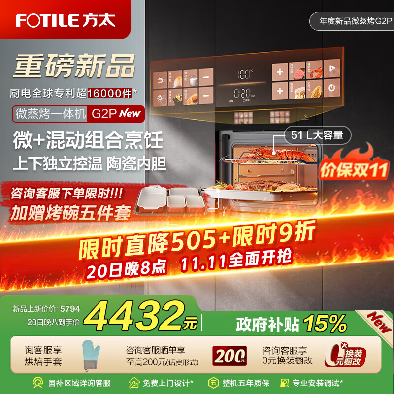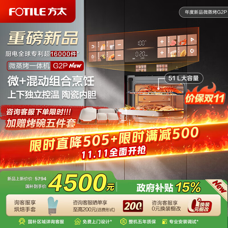 方太(FOTILE)微蒸烤一体机G2P嵌入式微波蒸烤炖炸五合一 微波炉 蒸箱烤箱51L大容量 瓷膜内胆 12.6英寸大屏幕 G2P