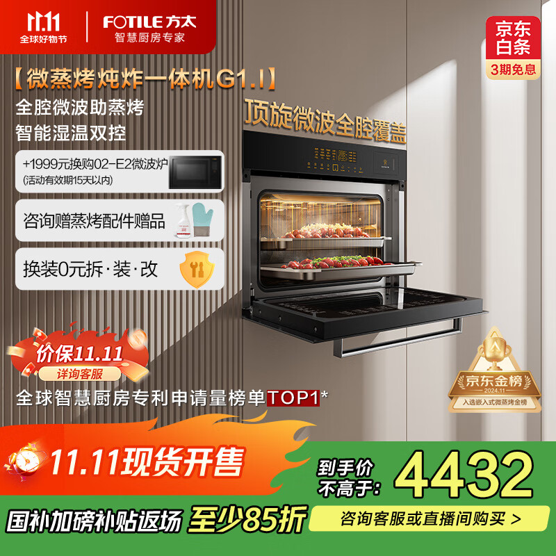 方太(FOTILE)微蒸烤炸一体G1.i 嵌入式蒸烤箱家用微波炉四合一44L家用大容量 智能多功能空气炸 全腔微波速烹 蒸烤微一体机