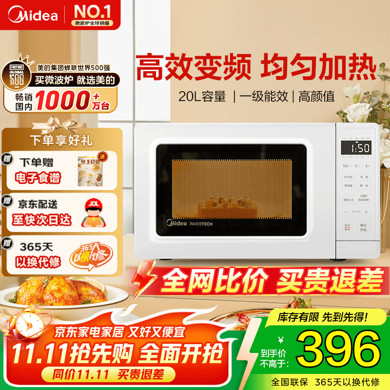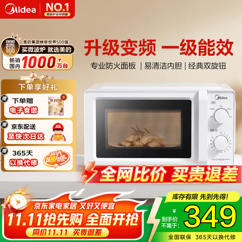美的家用微波炉节能一级能效 变频800W 小型20升转盘式均匀加热 经典旋钮式简易操控 pm20a1