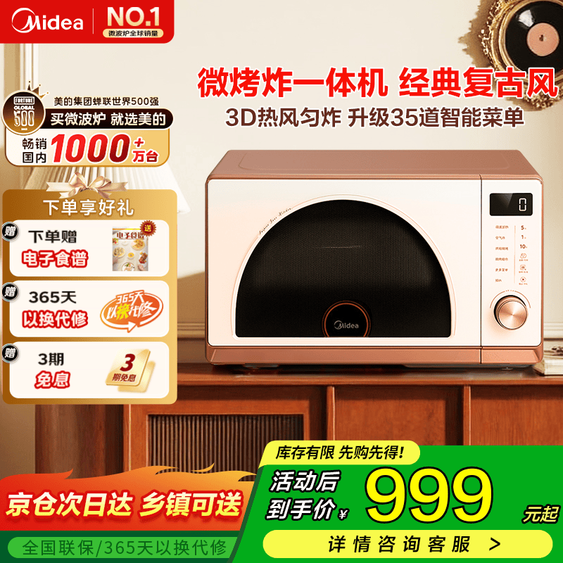 美的小滋味微烤炸一体机家用变频台式微波炉烤箱空气炸不锈钢内胆一级能效古典风23L(F23G3)