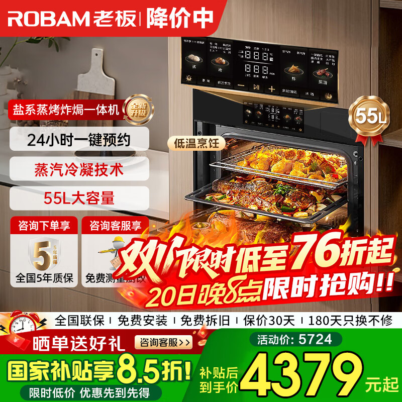 老板(Robam)盐系C90A/X-G1蒸烤炸焗一体机电蒸烤箱嵌入式家用APP智控 EXP专业控温搪瓷内胆自清洁 55L【火山岩黑C90X-G1】蒸烤炸焗四合一