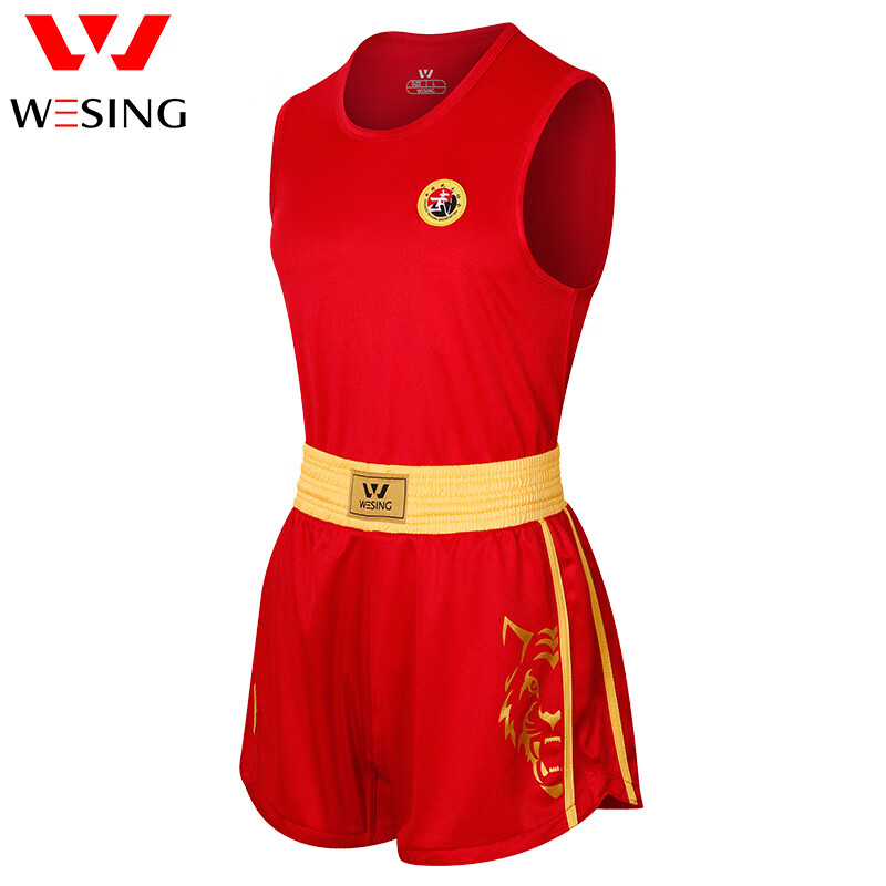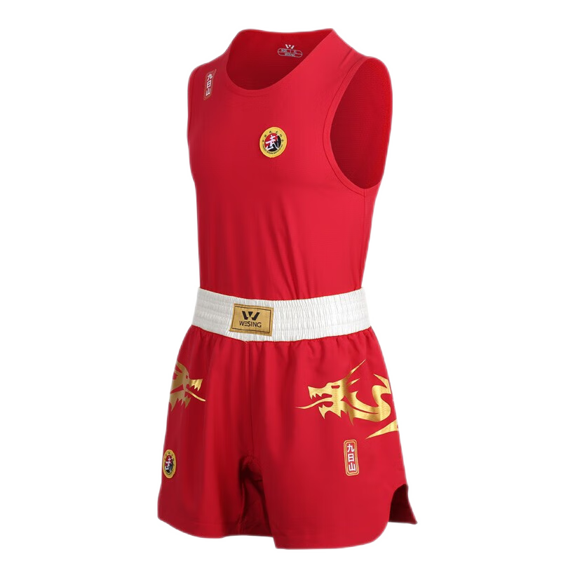 九日山 散打服 成人背心短裤训练比赛服装练功服武术搏击格斗运动服套装 男子虎服红色-黄腰带 L