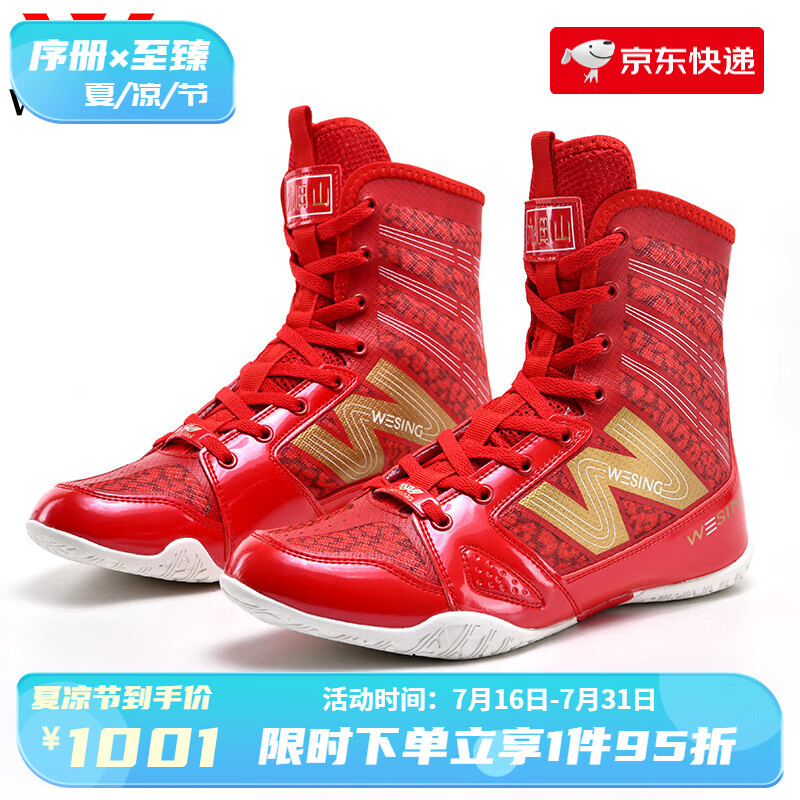 九日山拳击鞋男女武术比赛散打训练鞋透气搏击格斗高帮摔跤鞋 红色 36
