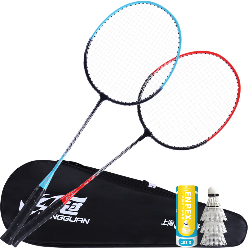 红双喜 羽毛球拍对拍升级款深凹槽比赛P100 红蓝对拍附3球