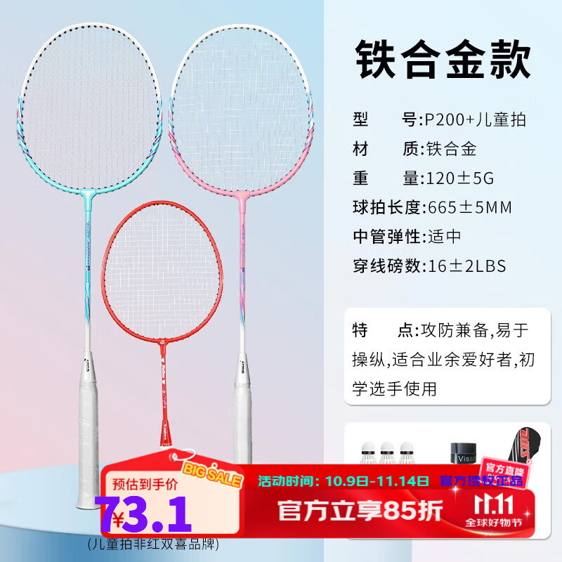 红双喜(DHS) 红双喜羽毛球拍儿童小学生对拍初学者3-12岁双拍两支装2只 【家庭款】成人双拍贈儿童拍1支