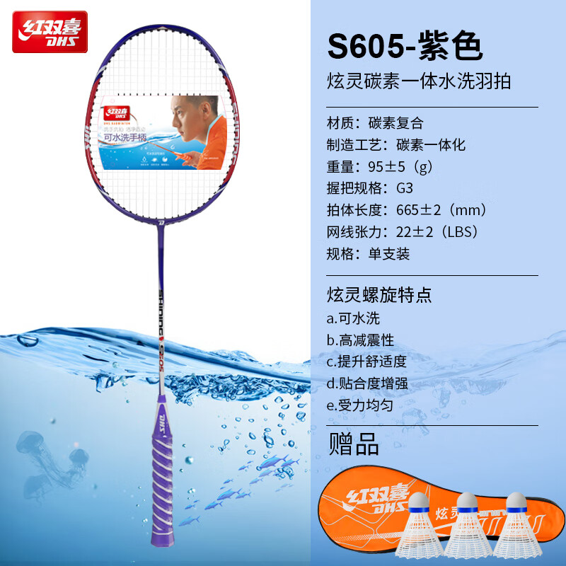 红双喜(DHS)炫灵水洗羽毛球拍双拍全碳素耐用单打超轻双拍套装 红双喜水洗拍S605【紫色1支】 成品拍