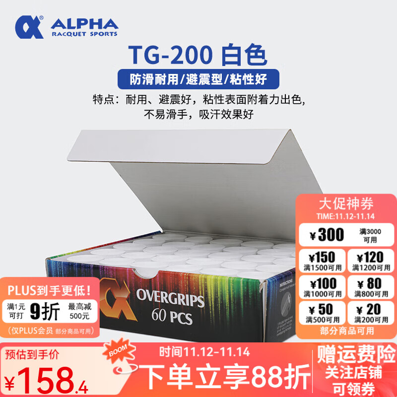 ALPHA阿尔法手胶/吸汗带羽毛网球球拍鱼竿弹弓把胶粘性自行车把手TG200 白色整盒60个