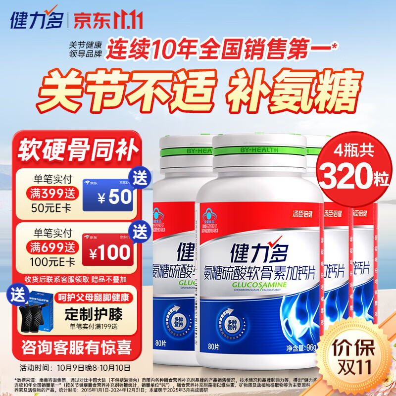 汤臣倍健健力多氨糖软骨素钙片中老年成人补钙硫酸软骨素氨糖钙片养护关节 【升级款】红氨糖80粒*4瓶共320片