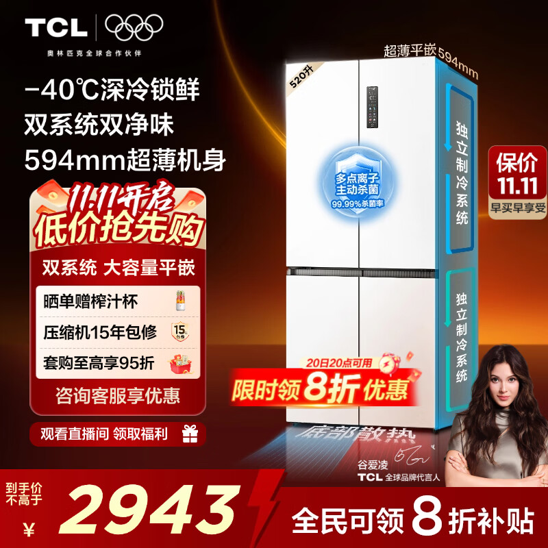 TCL 大无界520升十字四开门双系统双净味594mm超薄平嵌冰箱 大容量十字对开四门家用冰箱 以旧换新 R520T15-UQS韵律白