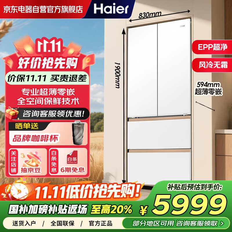 政府以旧换新补贴海尔217L三开门小型家用一级能效省电租房电冰箱