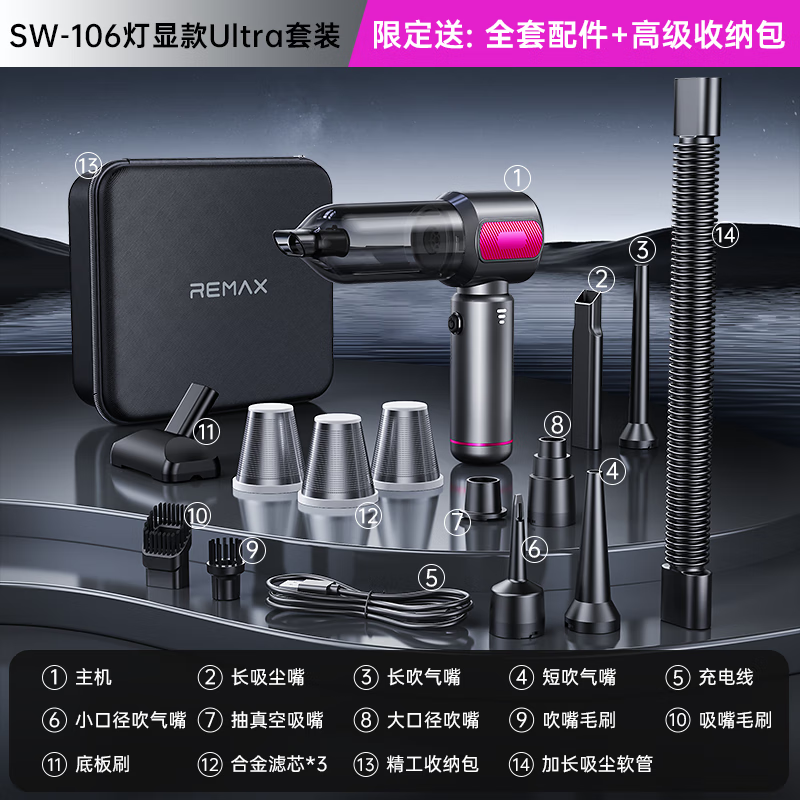 REWONDER【软包收纳丨电量灯显】车载吸尘器家用手持铅笔式大吸力长续航汽车吸尘器紫色20000Pa套装