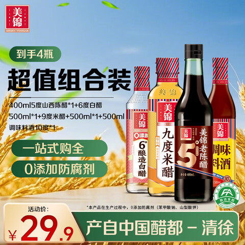 美锦山西老陈醋0添加防腐剂纯粮食酿造山西醋调味品组合装500ml*4瓶装
