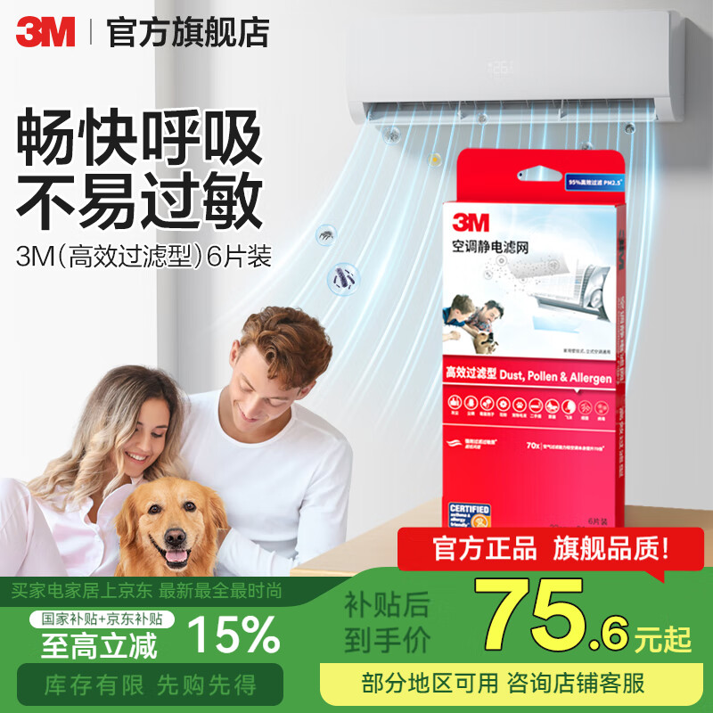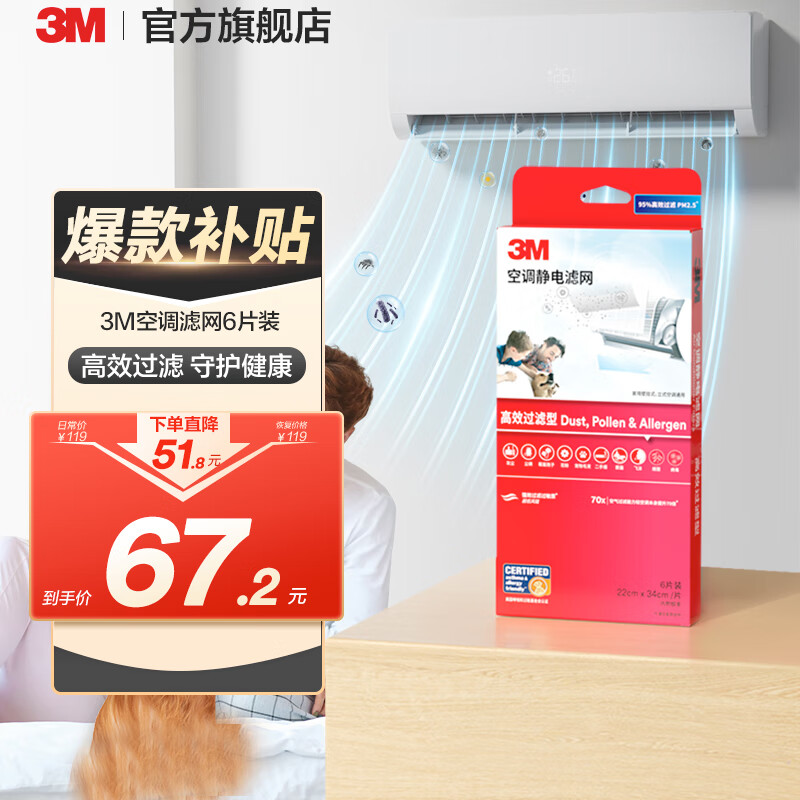 3M空调静电滤网净风片滤净滤芯片除PM2.5花粉尘螨过敏原宠物毛发二手烟除细菌配件cbg 【抗敏卫士】高效过滤型 新高效级(6片装)