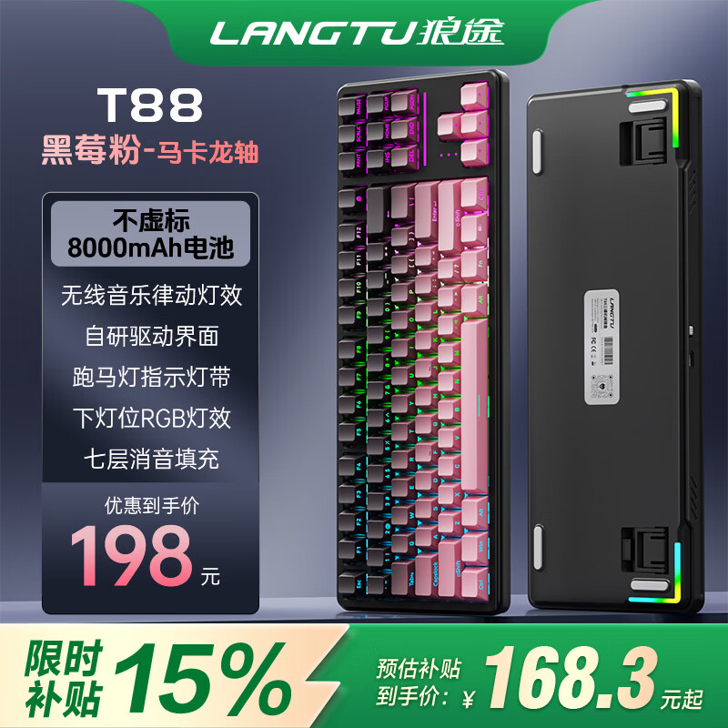 狼途T88Pro青提侧刻静音机械键盘客制化三模无线蓝牙办公电竞游戏专用 RGB灯效 Gasket结构 高颜值 黑莓/马卡龙轴/8000mAh