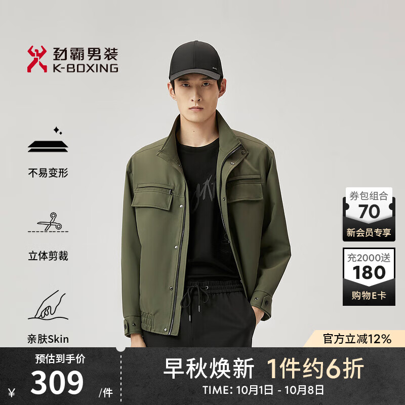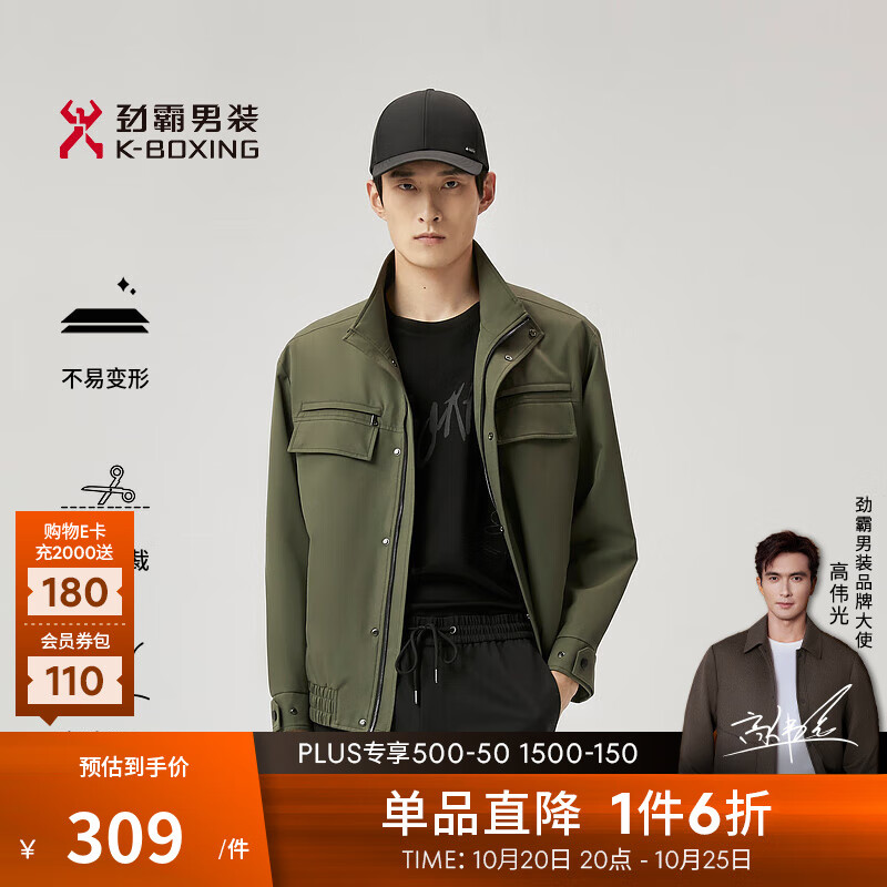 K-BOXING 劲霸男装 休闲简约工装风春季立领短版夹克外套男FKDT1310 茶绿色 175/L