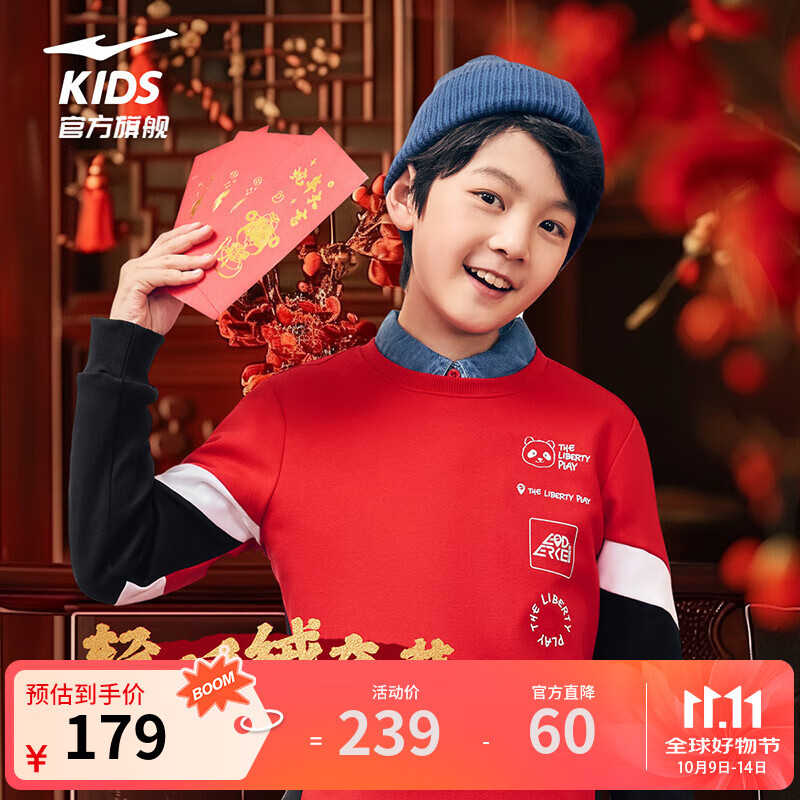 鸿星尔克童装综训儿童拼接长袖套装宽松卫衣长裤套装新年款针织套装 东方红 140