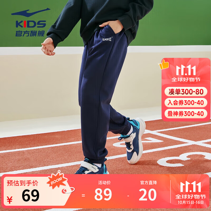 鸿星尔克童装裤子大童男童加厚针织长裤秋冬运动舒适加厚卫裤暖暖裤女童 蓝黑色 165