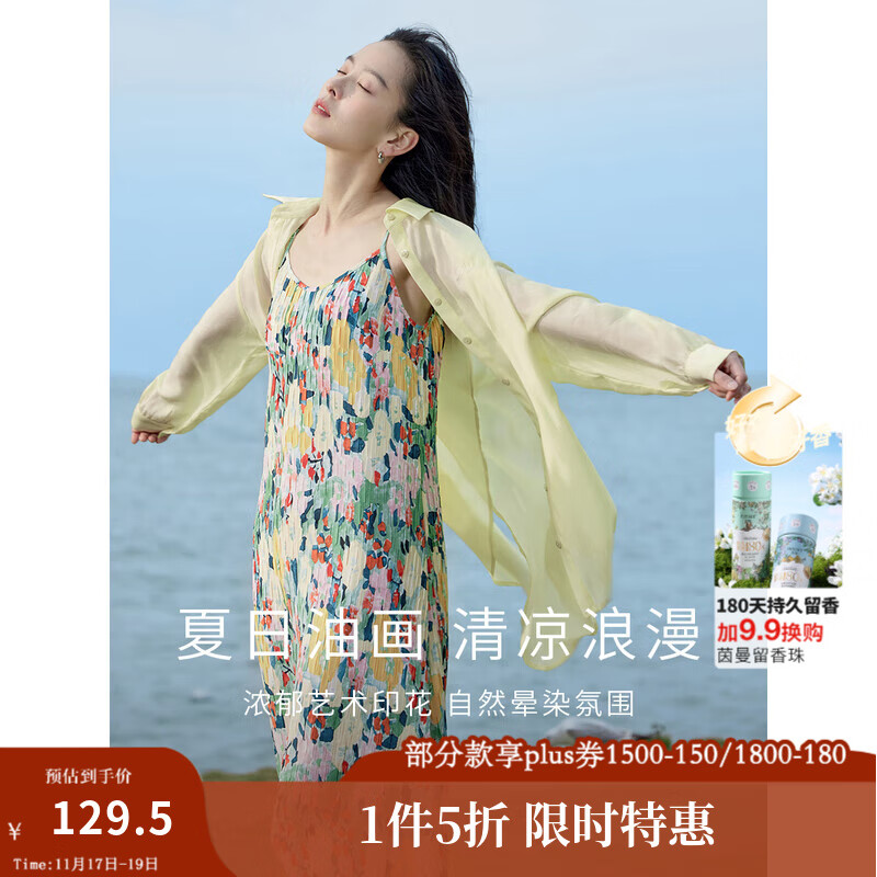 茵曼(INMAN)波西米亚吊带油画连衣裙女2025夏季新款度假裙子 石榴黄 M