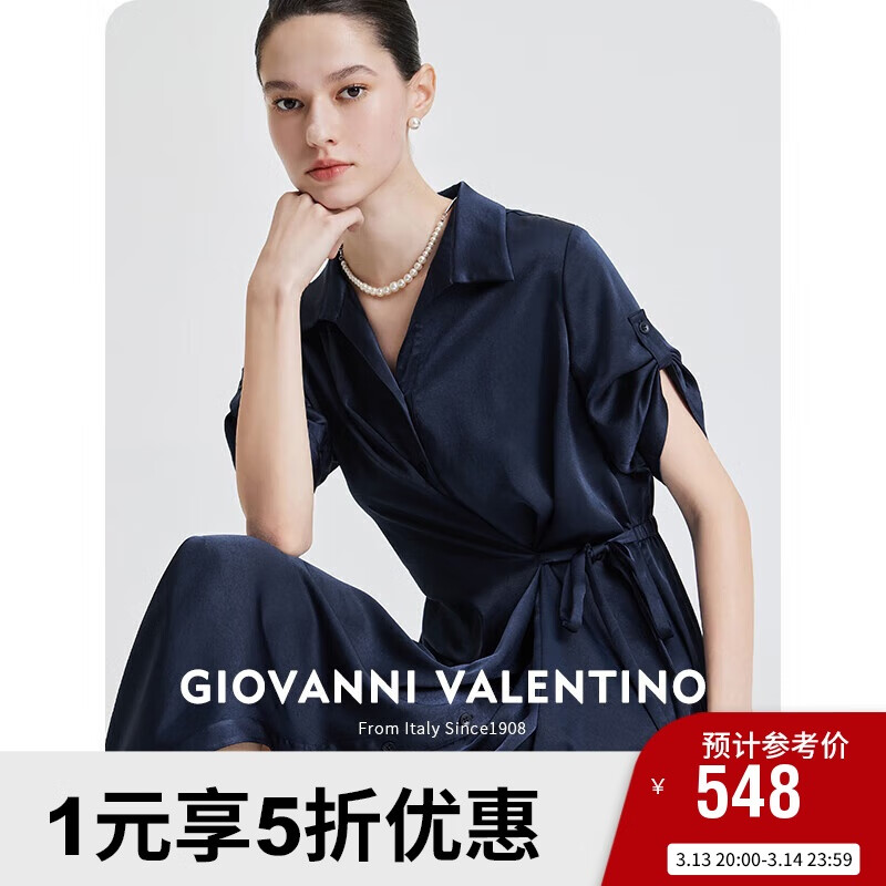 卓凡尼·华伦天奴(GIOVANNI VALENTINO)轻熟衬衫连衣裙夏季简约系带女装收腰显瘦高端裙子 藏青 M