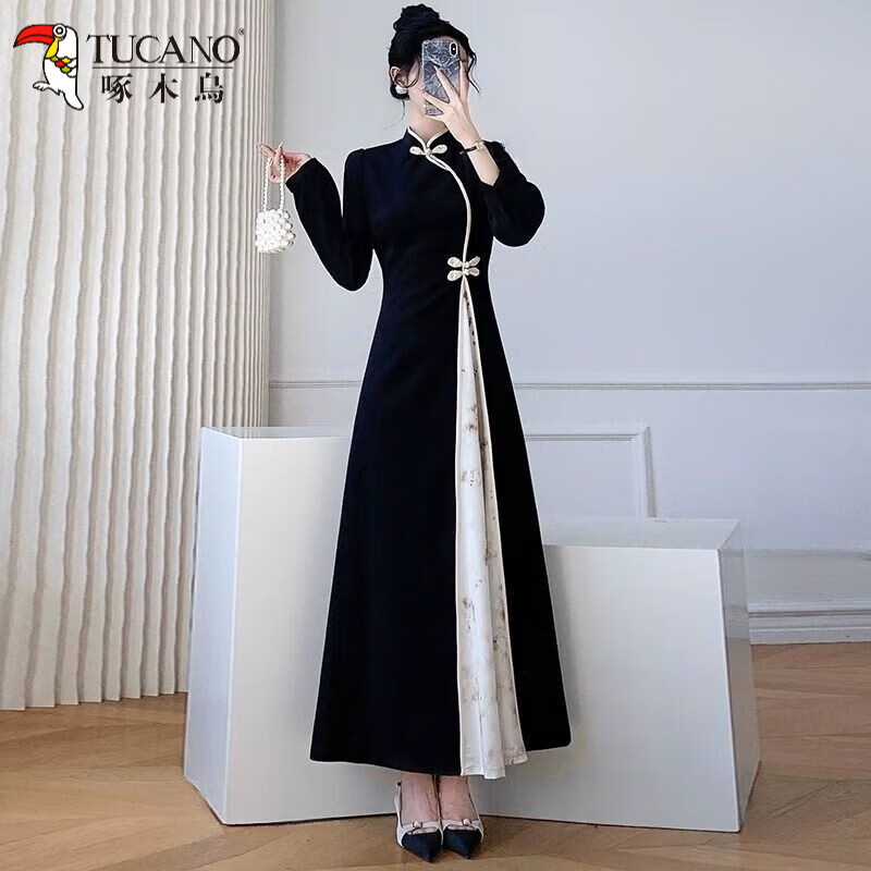 啄木鸟大码女装2025春秋新款裙子胖mm改良旗袍国风复古黑色新中式连衣裙 复古黑色新中式连衣裙 3XL 【149-160斤】