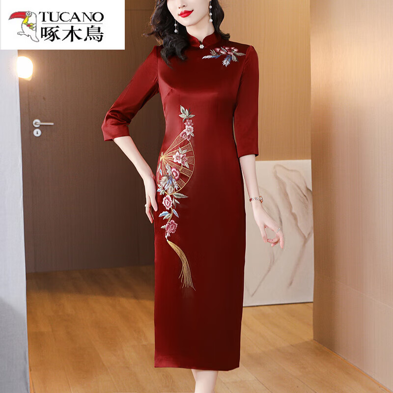 啄木鸟(TUCANO)喜婆婆婚宴装旗袍礼服连衣裙女装2025春秋新款高端真的丝桑丝裙子 酒红色 XL