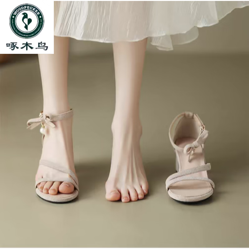 啄木鸟2025夏季新款气质法式珍珠凉鞋女小众配裙子蝴蝶结粗跟高跟鞋小码 杏色5厘米(专柜版) 36