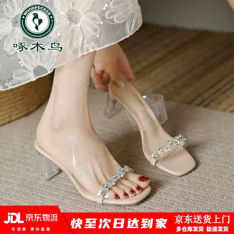 啄木鸟透明凉鞋女夏季2025新款高跟鞋一字外穿法式凉拖鞋粗跟配裙子女鞋 米白色 36 (230mm)