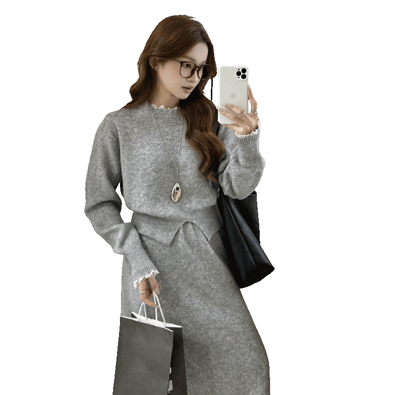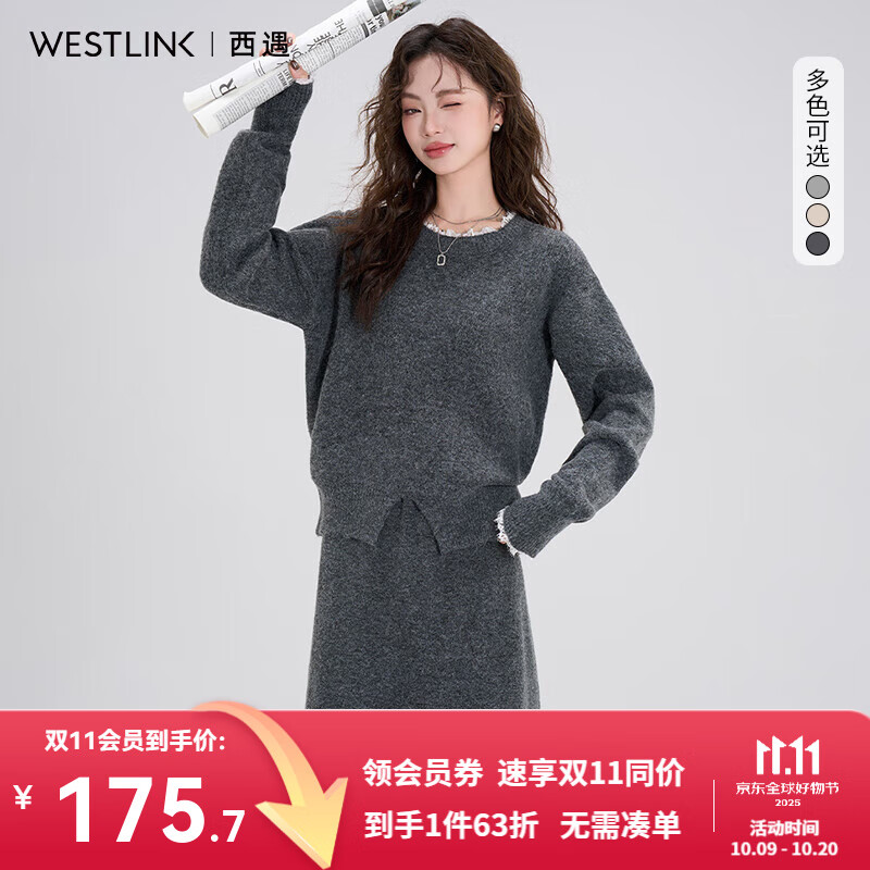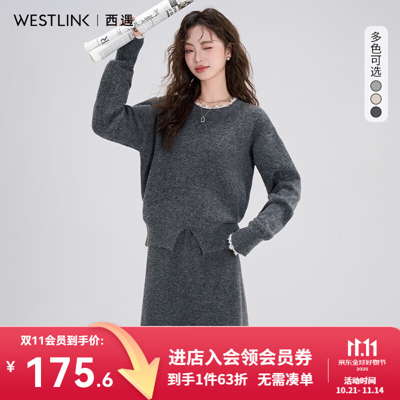 西遇(Westlink)针织半身裙子套装女2025年秋季新款蕾丝圆领宽松毛衣两件套 深灰色 (预售15天) M (160)
