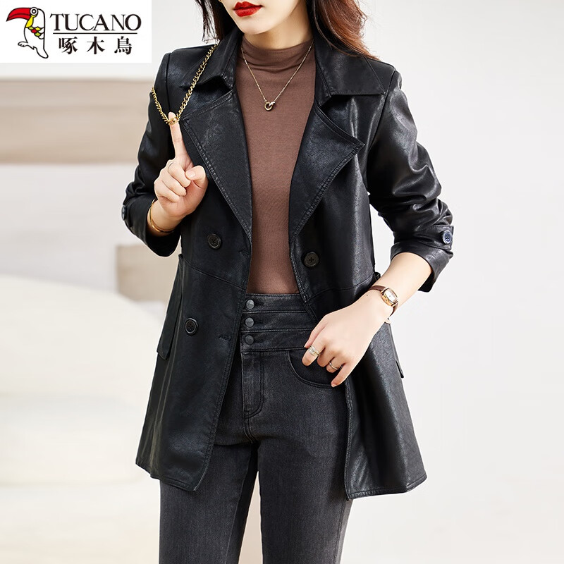啄木鸟海宁真皮皮衣外套女2024年新款春秋修身时尚女士绵羊皮中长款风衣 黑色 XL