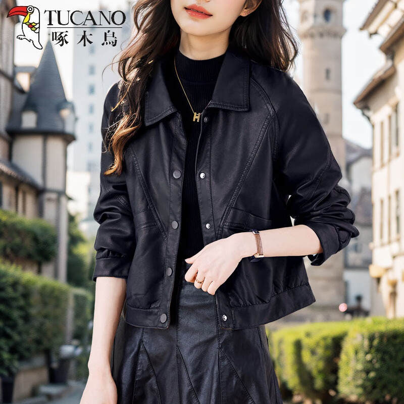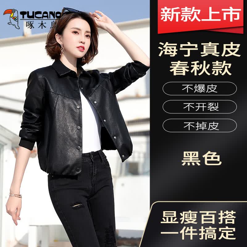啄木鸟海宁真皮皮衣女短款2025年新款女士小个子绵羊皮夹克外套 黑色薄 轻薄 XL 适合115-125斤