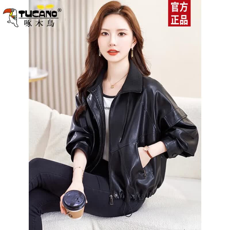 啄木鸟真皮皮衣女短款韩版2025新款海宁立领气质夹克休闲宽松绵羊皮外套 黑色 L 120-145斤