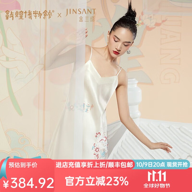 金三塔×敦煌博物馆联名睡衣女重磅真丝定位花系带睡袍单袍情人节礼物 沙金色-吊带裙 L