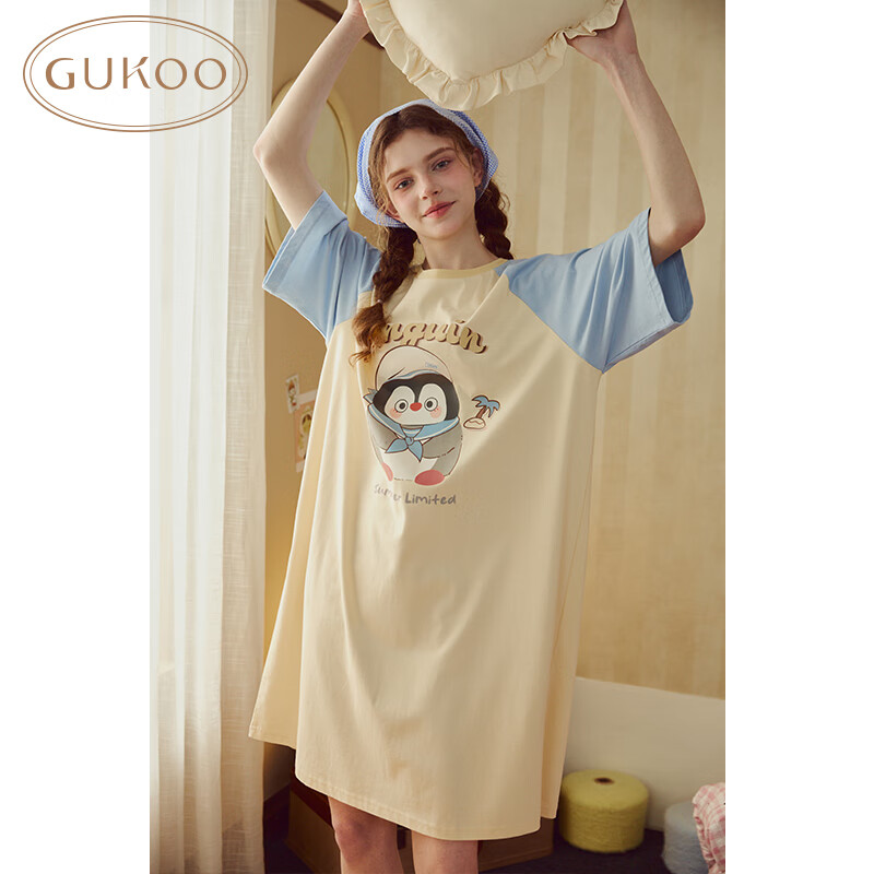 果壳(Gukoo)睡裙女春夏新款小企鹅系列睡衣女睡裙宽松睡裙圆领大卡通家居服B 奶油黄睡裙 L