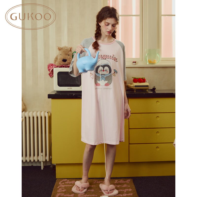 果壳(Gukoo)睡裙女春夏新款小企鹅系列睡衣宽松大卡通家居服睡裙 天堂粉 S
