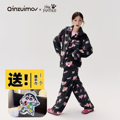 百亿补贴:亲嘴猫【粉红豹】法兰绒翻领卡通可外穿少女保暖睡衣家居服套装冬