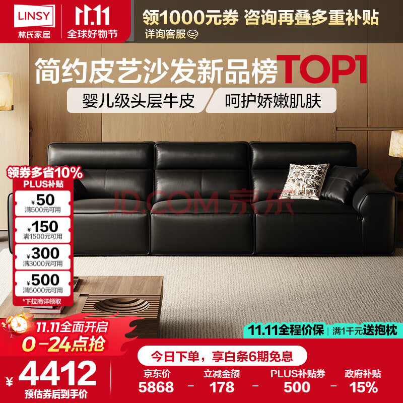 林氏家居现代简约大黑牛真皮沙发2025新款国家补贴加高靠背客厅沙发PS504