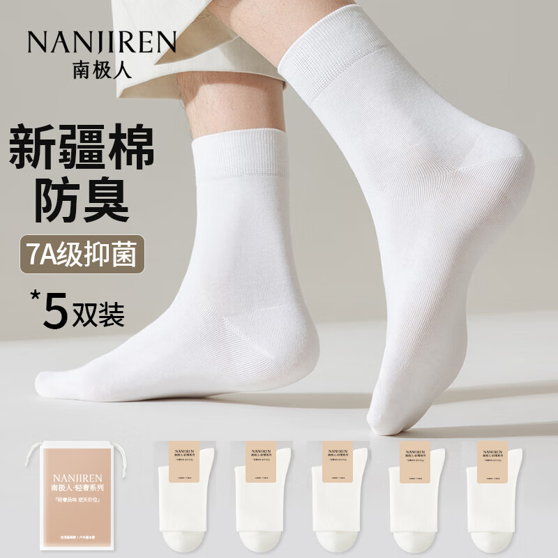 百亿补贴:南极人(Nanjiren)【轻奢系列】男士袜子男中筒袜舒适精梳棉7A抑菌休闲商务男袜5双 【白色】 5双 均码