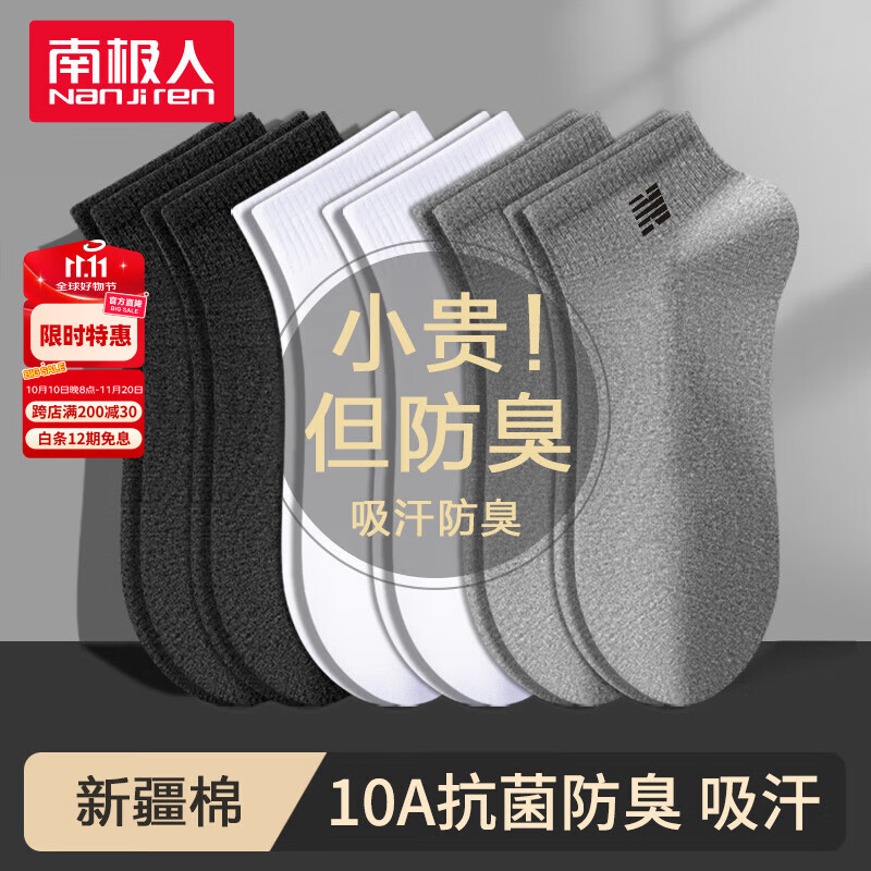 南极人袜子男款短袜秋冬季防臭7a抗菌棉袜男生船袜青少年男袜潮PB