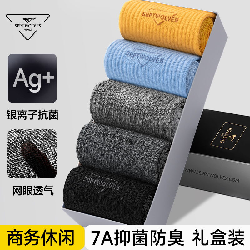 七匹狼袜子男7A抗菌纯棉防臭袜抑菌袜商务休闲棉袜中筒袜全黑6双