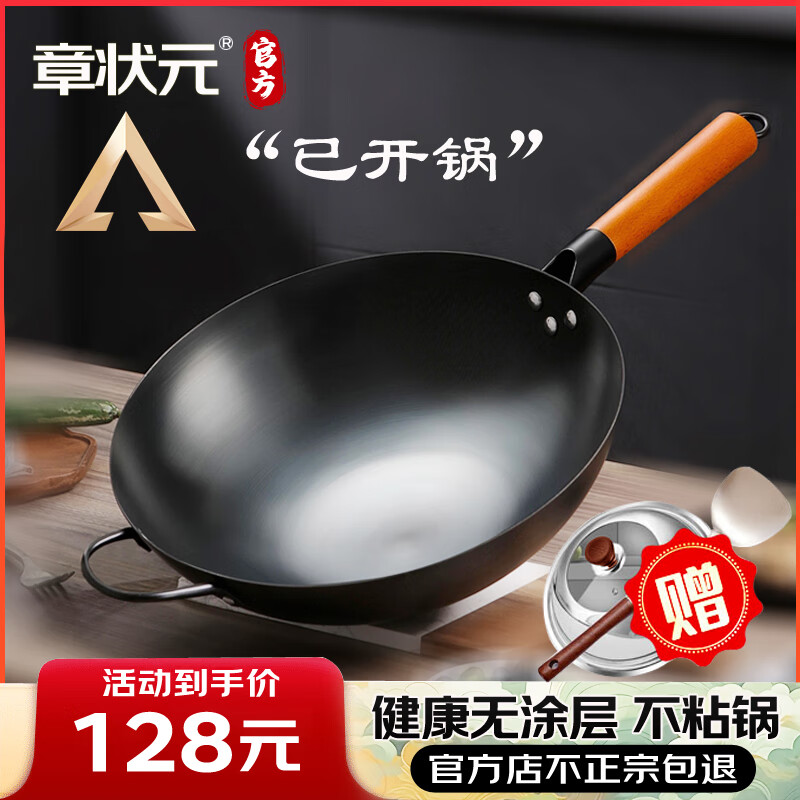 章状元章丘炒锅铁锅无涂层家用不粘锅已开锅传统精铁老式炒菜锅燃气灶 32cm大师款带耳(盖子铲子) 32cm