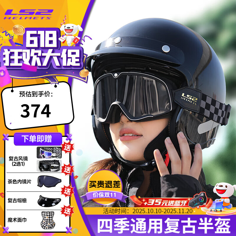 LS2【双11爆款头盔】复古四季男女半盔机车巡航秋冬摩托头盔of599 亮黑【送复古四件套】 4XL(建议63-64头围)