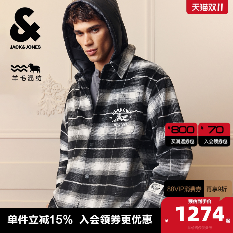 165/88A/XS A06雪白黑色 杰克琼斯奥特莱斯男装毛呢大衣冬刺绣格纹可拆连帽领宽松外套上衣