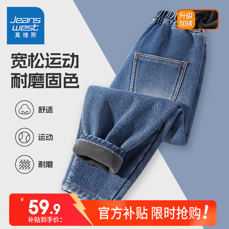 真维斯男童牛仔裤秋冬款小男孩冬季加绒保暖裤中大童宽松休闲加厚长裤冬 【加绒款】牛仔蓝/J纯色 140