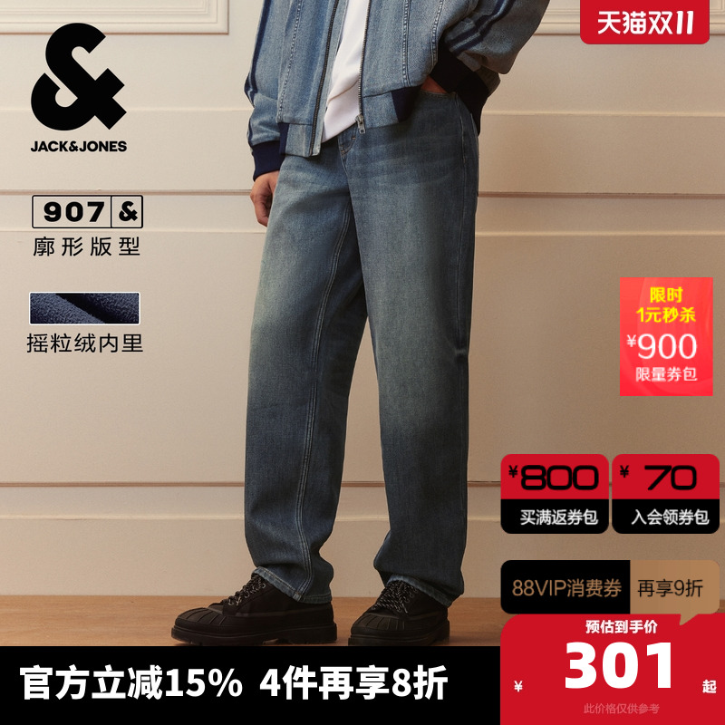 E39中牛仔蓝 28/30 杰克琼斯奥特莱斯男装士冬季新款牛仔裤宽松加绒内里时尚百搭裤子